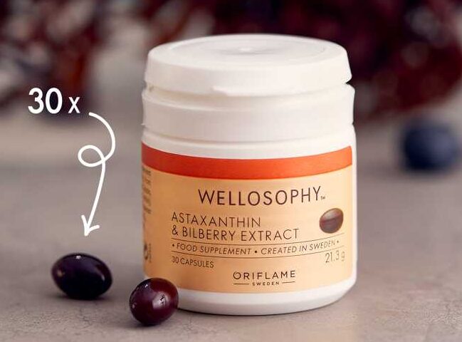 Mennyiség 1 kapszulánként: áfonya kivonat 50 mg, C-vitamin 12 mg (15%*), asztaxantin 3 mg, E-vitamin 1,8 mg (15%*).